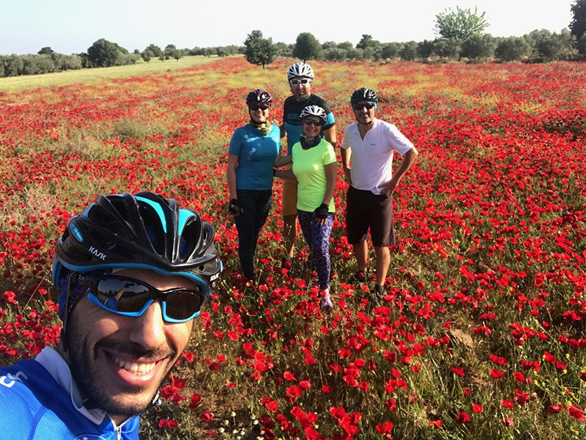 Kahvaltıdan sonra iskeleye doğru yola çıkıyoruz. Bu sırada arkamızdan bir ses geliyor. Dönüp bakınca bir de ne görelim? Karşımızda Bodrum’dan arkadaşlarımız Seçkin ve Kerim. Şaşkınlığımızı attıktan sonra nerden çıktınız, nasıl geldiniz diye soruyoruz. Meğer dün gece gelmişler ve sahilde çadır kurmuşlar. Vay arkadaş, artık 5 kişi devam edeceğiz yolumuza. Bu sürprizle enerjimiz iyice tavan yapıyor. Tur 5’lisi gelincik tarlasında hemen bir fotoğrafı hak etti. ?