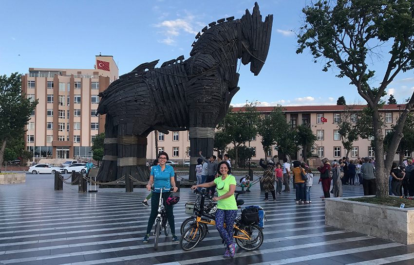 Biletlerimizi aldıktan sonra artık tura çıkma vakti geliyor. Tam pedallar dönüyor ki telefonum çalınca duruyorum. Arayan Ayşegül, nerede olduğumuzu sorarken tam karşımızda beliriyor. Burada Ayşegül ve Fatih ile tanışıyoruz ve tura 7 kişi olarak devam ediyoruz. Rota hakkında Ayşegül’e biraz bilgi veriyorum, sağolsunlar bize burada rehberlik yapıyorlar.