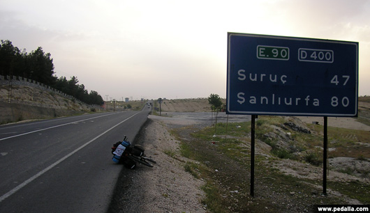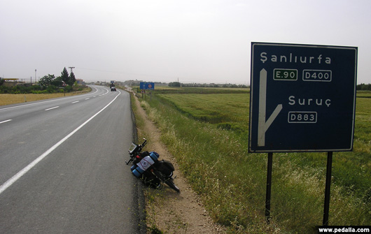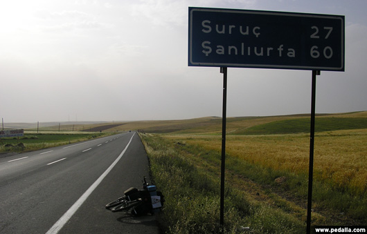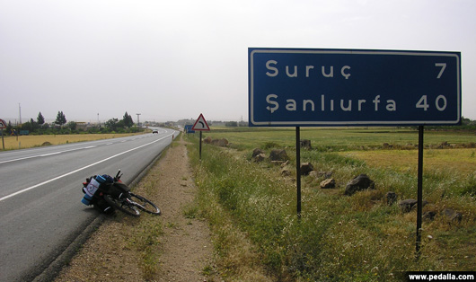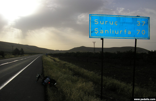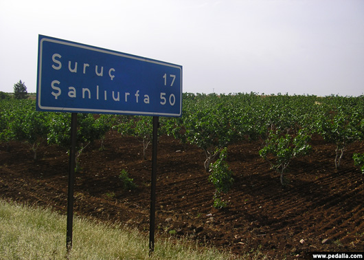 Suruç kavşağını yine rüzgâra karşı geride bırakıyorum. Suruç ana yoldan 5-6 km kadar içeride kalıyor. Normal şartlarda girip, ilçeyi gezmek istiyordum. Ama rüzgâr maalesef buna engel oldu. Hiç iyi değilim ve şuan için tek bir derdim var, o da biran önce Şanlıurfa?ya ulaşmak.