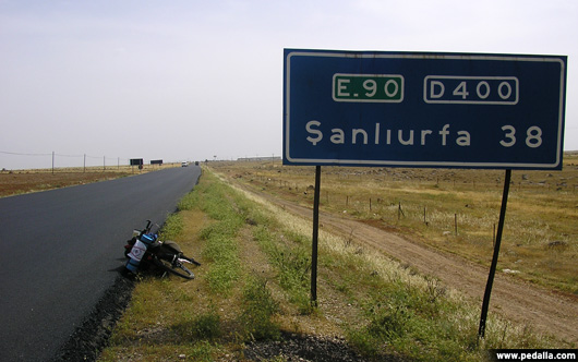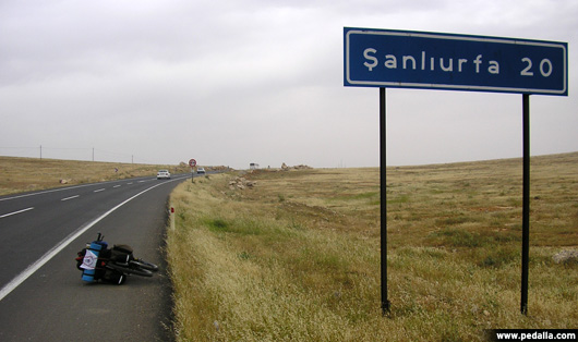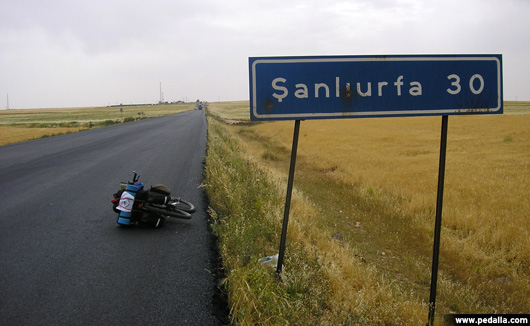 Çok sıkılmaya başladım, biran önce Şanlıurfa?ya ulaşmak istiyorum. Böyle olunca yol daha bir çekilmez hala bürünüyor. Bu çünkü ?Önemli olan varmak değil, yolda olmaktır? felsefemize hiç uymuyor. Şanlıurfa’ya son 50 km kaldı ve fıstık tarları eşlik etmeye devam ediyor.