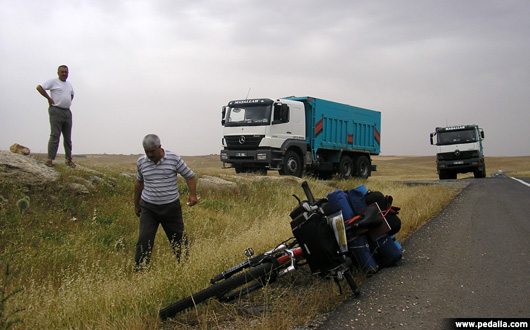 Yol bu noktadan sonra işkence olmaya başladı. Nerede bir petrol istasyonu görsem durup biraz yatışmayı deniyorum. Ama nafile, rüzgâr son hızıyla karşımdan esmeye devam ediyor. Yol boyunca mercimek ve fıstık tarlaları eşlik ediyor bana. Ama bu güzellikleri izleyemiyorum bile stresten. Mercimek tarlalarında çalışan işçiler ile kısa bir muhabbet anı…