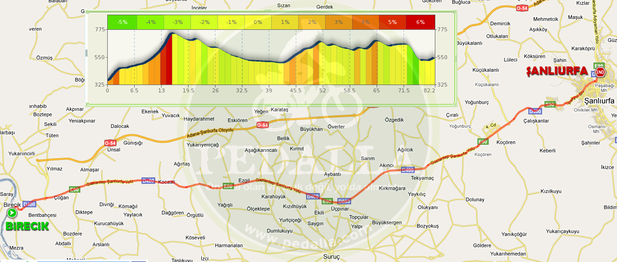 Birecik ? Şanlıurfa 80 km. Yolda mercimek, fıstık ve buğday tarlası manzarası hiç eksik olmuyor, bunun yanında ise yer yer rampalı ve düz. Ama ters rüzgâr en büyük sorun. Rüzgâr olmadığı sürece çok eğlenceli bir yol. Bunun dışında aklımda kalan başka bir zor tarafı yok. Yolun 6 km içerisinde kalan, ben her ne kadar göremesem de, Suruç ilçesi mutlaka görülmeli diye düşünüyorum. Ardından 40 km kadar sonra Şanlıurfa?ya güzel bir iniş ile giriliyor. Yolun büyük bir kısmı ise dar ve kamyon trafiği yoğun olduğundan dolayı çok dikkat edilmeli. D400 karayolu aynı zamanda Türkiye?yi Irak?a bağlıyor.